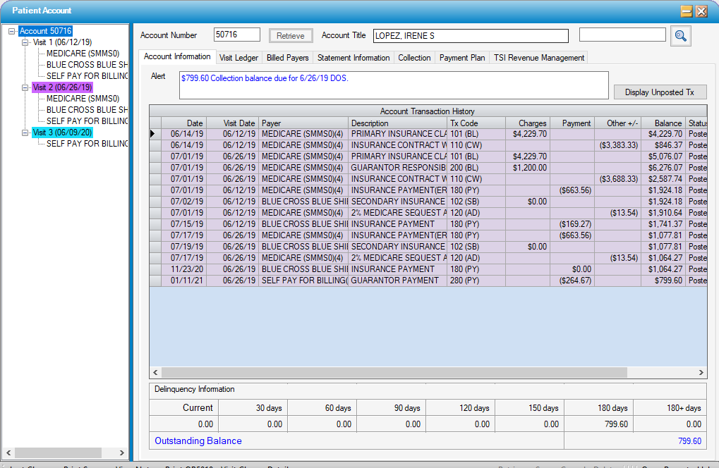 - Delinquency Information is a summary of all visit balances that share the same account number. This will display the aging and total outstanding balance of the account.