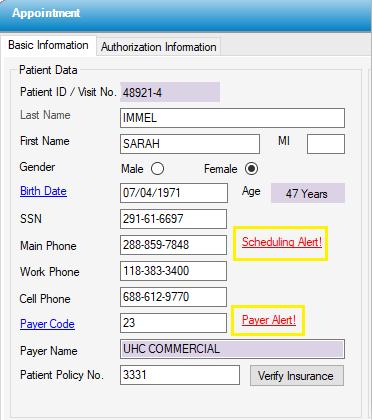 If a Scheduling Alert has been created in Patient Demographics, a red hyperlink will be visible indicating that there is a Scheduling Alert!: