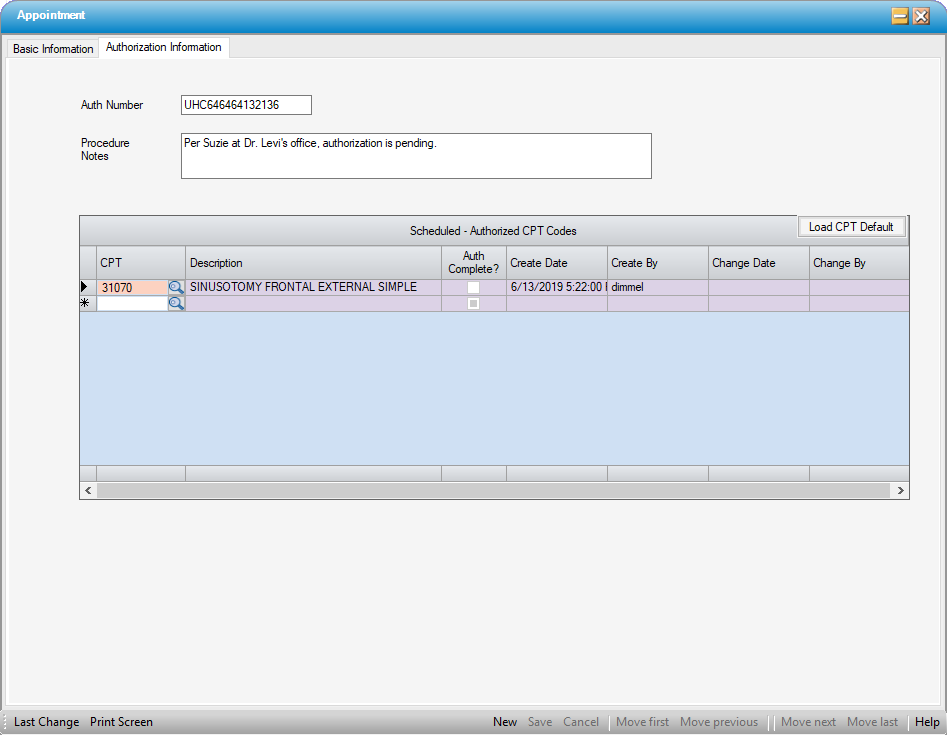 Enter the requested or authorized codes in the Scheduled-Authorized CPT Codes grid. Codes can be entered by selecting to load CPT codes entered in Procedure Configuration, by manually typing in the codes, or by using the magnifying glass to conduct a search.