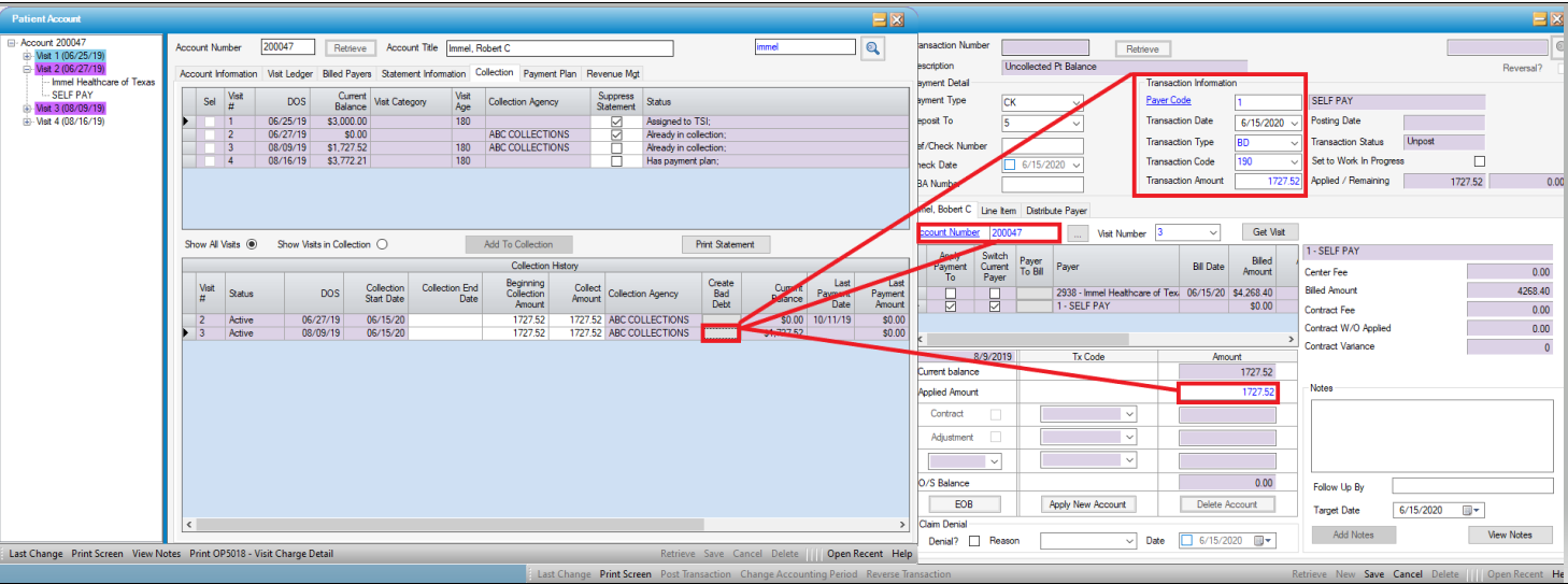 - To write off the balance to bad debt at the time of collection assignment, select the function key in the "Create Bad Debt" column, which will open that transaction in the Payments And Adjustments form. Payer Code, Transaction Type, Transaction Code, Transaction Amount, Account Number, Visit Number, and Applied Amount will all populate based upon this selection. Click Save and post the transaction, either directly from the Payments And Adjustments form (if permissions allow) or via Transaction Posting.
