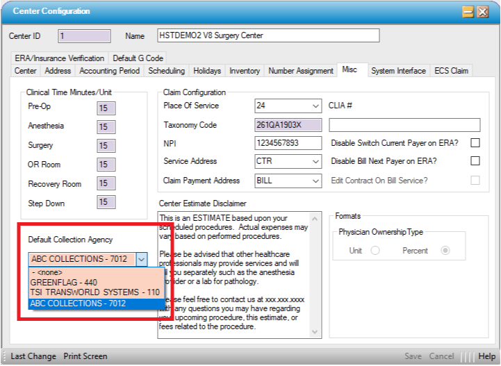 Once the Payer(s) have been set up, a default collection agency can be set inCenter Configuration > Misc. tab by using the drop-down to select from agencies that were created. (Please be reminded that if an agency was just added, it may be necessary to right click on the drop down arrow and select refresh to enable the new entry for selection.)