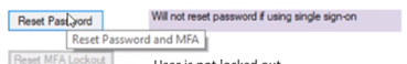 The button label has been changed from Reset to Reset Password. When MFA is enabled, and Reset Password is clicked, the user will be required to change their password from the temporary password and to re-Authenticate via MFA on their first log in after password reset. The hover message for this button is “Reset Password and MFA”. This action, resets the user's MFA Max Attempt Limit and Remember Me (In Days) to 0 in the database. If MFA is not enabled, the user will only be required to change their password upon login.