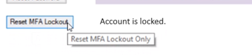 This button is only enabled if MFA is enabled at a center this user has access to and their account is locked. When an account is not locked, the following message will display next to the button: User is not locked out. When the account is locked the message next to the button displays: Account is locked. When this button is clicked, the account is reset and the message will display The Account has been reset. This option can be accessed by those users who have permission to Reset Passwords. The hover message for this button reads Reset MFA Lockout Only. This option does not affect user passwords.