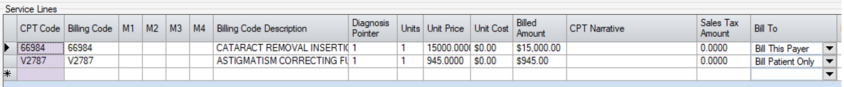 Only 66984 will appear on the secondary claim due to the “Bill Patient Only” setting in Charge Entry.