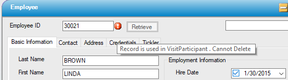 NOTE: An Employee cannot be deleted if they have been attached to a case. A red error ball will appear with a hover message indicating why the Employee cannot be deleted. The only way to delete them would be to remove them from every case to which they have been attached. Best Practice is to Inactivate the Employee rather than deleting.