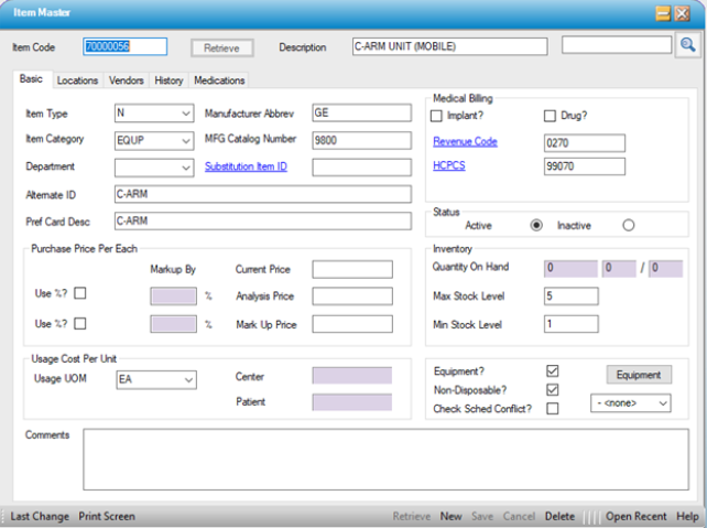 If a center has multiple units of the same Equipment (i.e. 2 C-Arms), it is not necessary to create a separate item master record for each one. Multiple Equipment records of the same type can be associated to one item master record through the Equipment form.