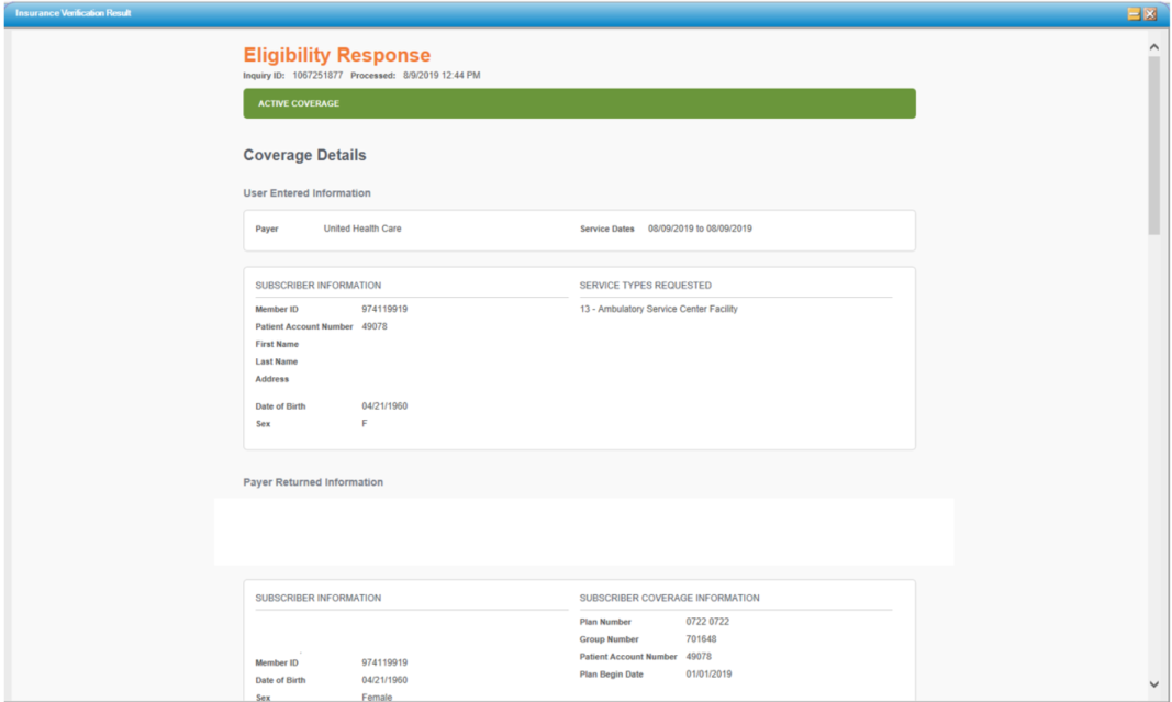 - If an eligibility request has been transmitted directly to the clearinghouse, there will be another box below the Last Visit Insurance box labeled Verification History that will list any payer for which insurance verification information exists Double click the payer name to view the eligibility response document.