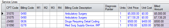 • For payers that require only one line item per HCPC code, selecting will combine them into one charge line which will reflect the total quantity and price for those items.