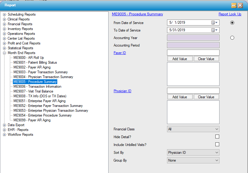 • Sort the results by Physician ID, Payer ID, Patient ID, Primary Procedure, Date of Service, Financial Class or Billed CPT Code.