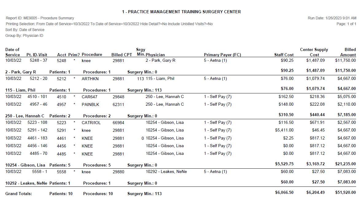 • Results can be grouped by Physician ID, Anesthesiologist, Payer ID, Financial Class, Primary Procedure, Date of Service or Physician Specialty.
