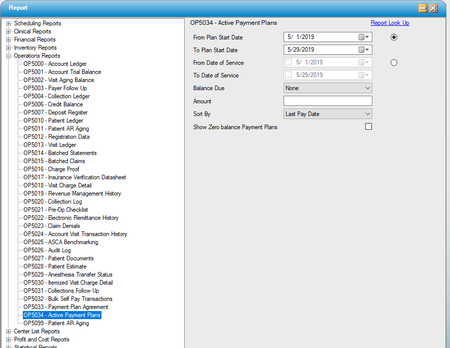 This report can be generated by Plan or Date of Service from/to dates. It can also be filtered by the balance due. By default zero balance plans are not included but can be added by clicking a check box.