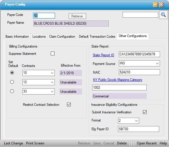 Billing Configurations such as suppressing statements, assigning default contracts, and restricting contract selection can all be set up on the Other Configurations tab in Administration > Payer > Configuration. In addition, State Reporting data such as Payment Source and NAIC can be added here as well as the NY Public Goods Mapping Categories.