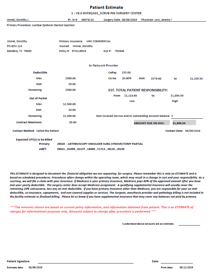 To print a Patient Estimate, select the Print Estimate Report drop-down and choose either Print Detail or Print Summary. Users can also select whether or not the Secondary Payer prints on estimate by checking the Display 2nd Payer on estimate box. HST Practice Management will generate a PDF for the patient to sign for the facility's records. The estimate information is saved for this visit and can be re-accessed by going to Registration > Insurance > Network Information and re-selecting , or through Reports > Operations Reports > OP5028 - Patient Estimate.