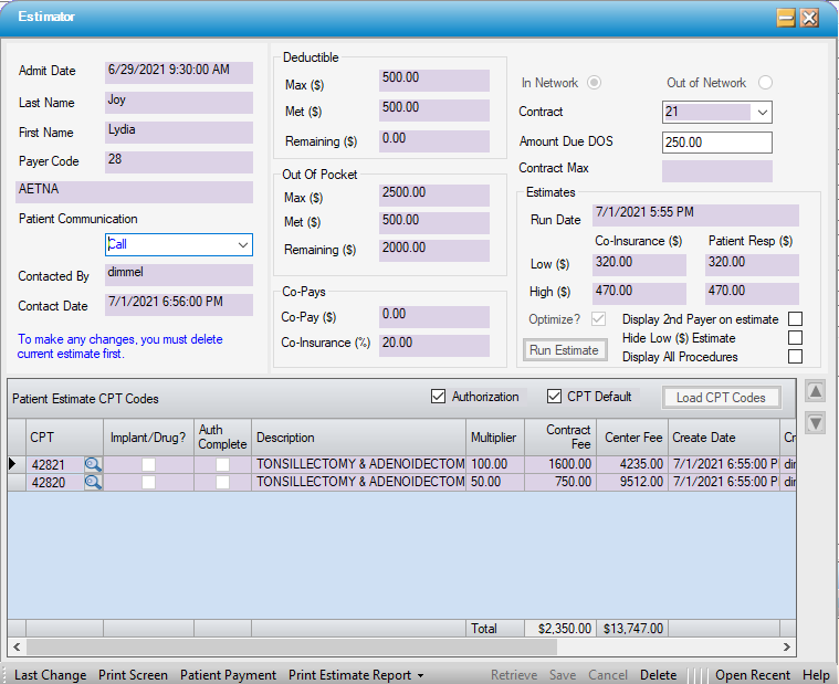 NOTE: The system will maintain only 1 Estimate at a time. In order to change anything other than Amount Due on DOS, the estimate must be deleted and run again after the changes have been saved.If the insurance is changed on the Payer Information tab, the system will automatically delete the existing estimate.