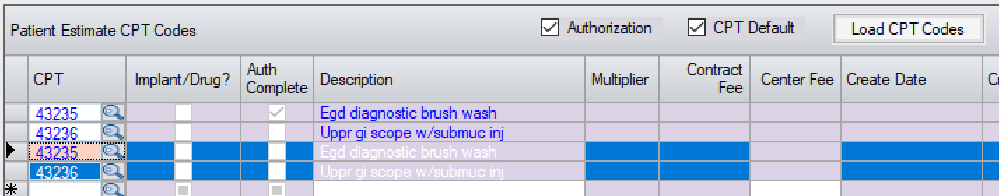 - All CPT and HCPC codes entered in the Authorization Info tab will be loaded into the Estimate, whether or not the Auth Complete? box was checked, but the Auth Complete column will indicate those codes for which authorization was completed.