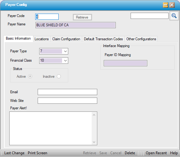 If Standardize Payer Code was not selected in Enterprise Configuration, Payers can be created and Configured on the Payer form.