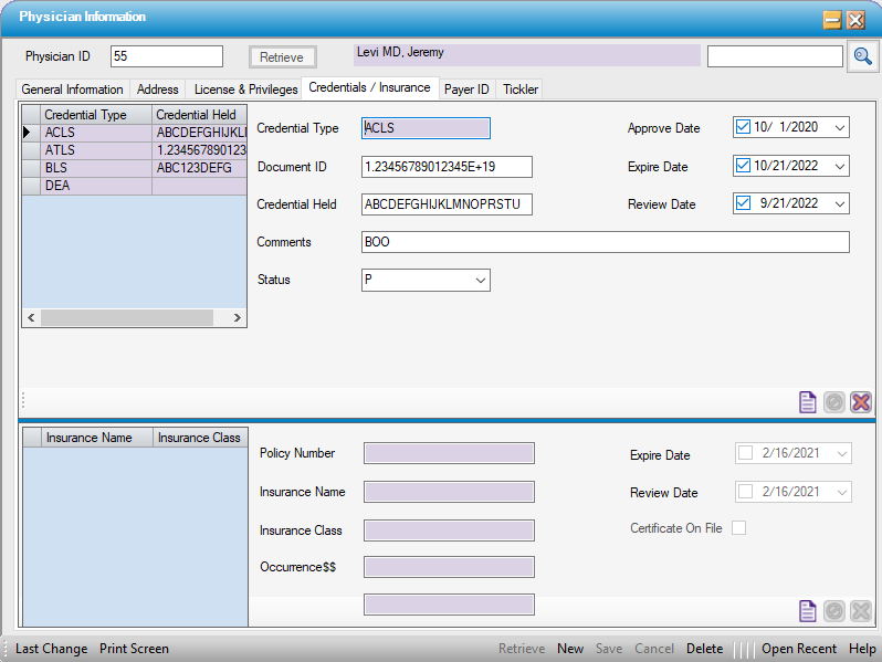 - Double-click the Credential / Insurance to be edited in the grid view on the left side.