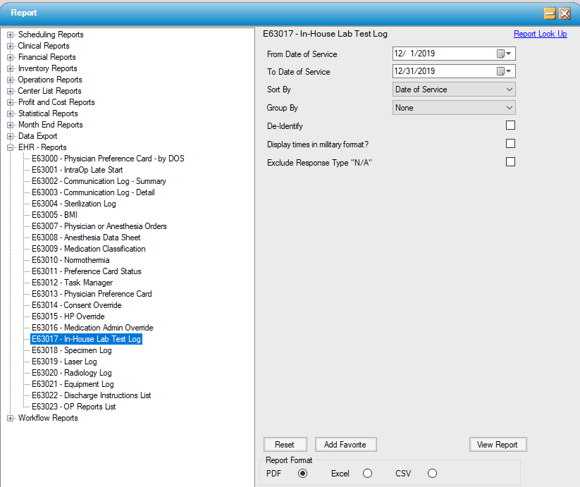 This report provides a log of all In-House Lab tests that were performed at the Center for a selected date range and several sorting and grouping options are available. The chart must contain the In-House Lab Results BLOC for the lab results to be included in this report.