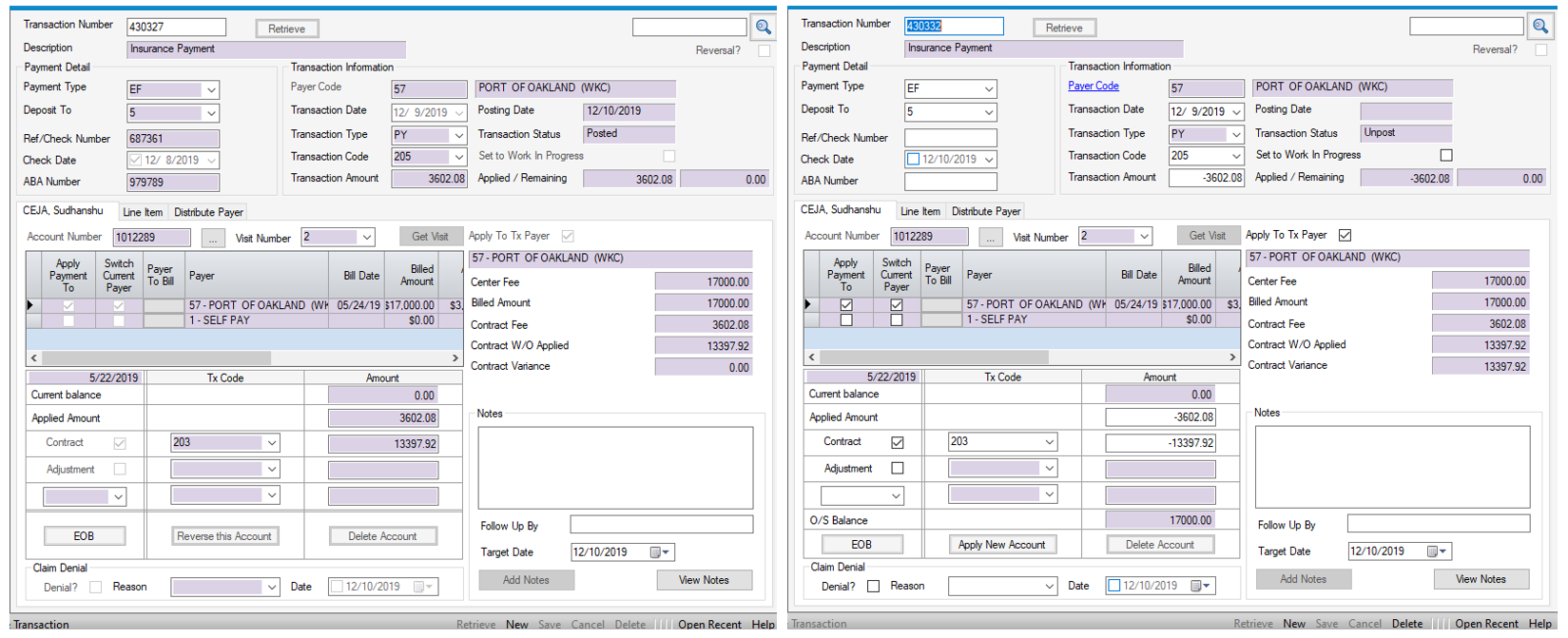 A reversed transaction will appear on the ledger in the Patient Account as a (Reversal). A negative payment will show up simply as a negative payment. For tracking and reconciliation purposes, reversing a transaction is the best practice.
