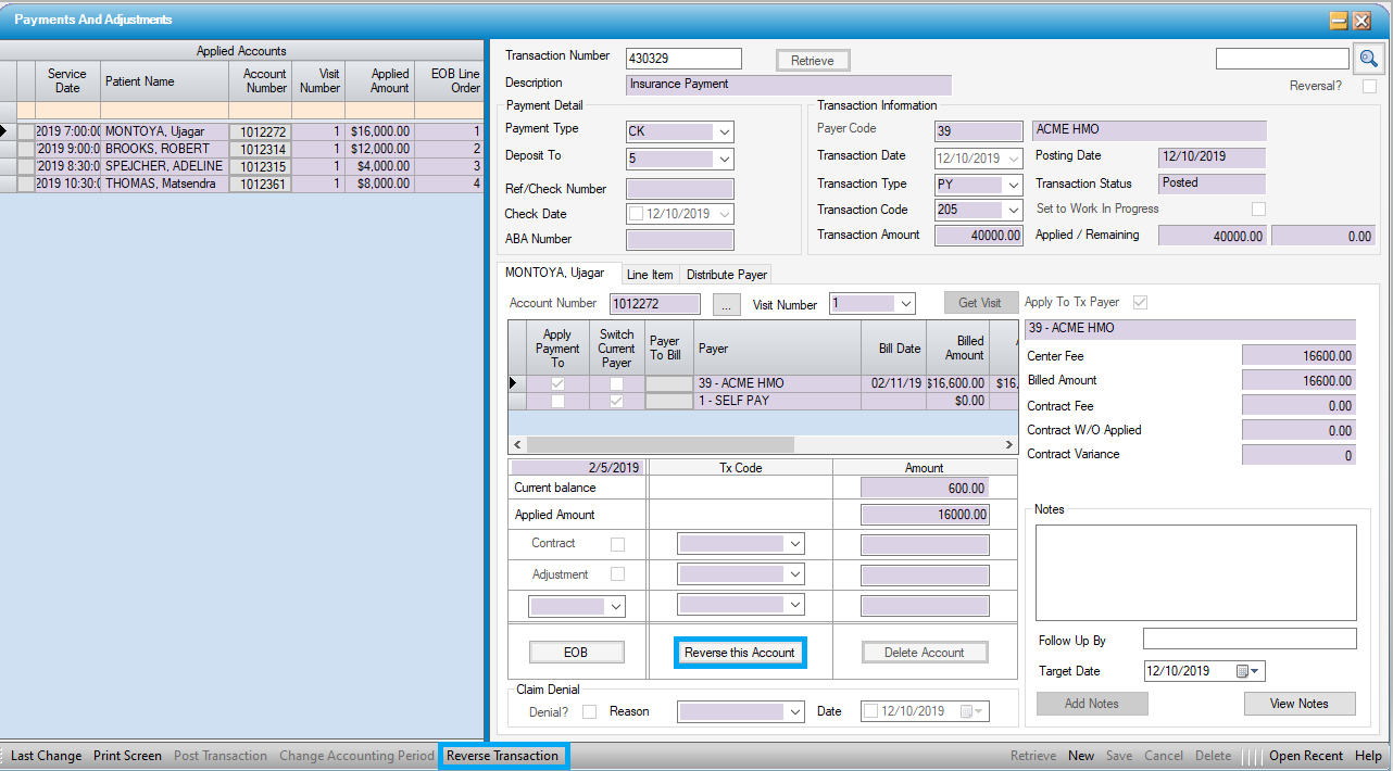 NOTE: There is a setting in Statement Options that will prevent transactions that have been reversed from appearing on patient statements, so long as the reversal was performed within the same statement cycle as the original transaction.
