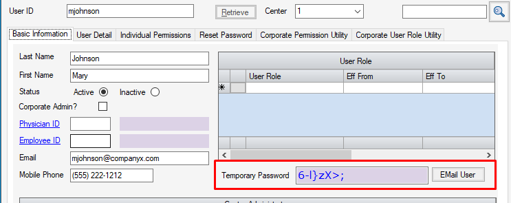 • An e-mail must be entered for the User on the Basic Information tab in order to use the EMail User button. Click the Email User button to e-mail the temporary password to the Email saved in the User Profile.