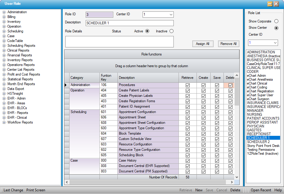 The User Roles form allows centers to create templates for user permissions, making it easy to assign permissions to individual users that share the same general functions. This can be done on either a corporate or center level, depending on the center configuration.