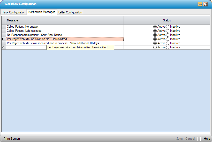 Primary Claim not printed/sent | If a Primary claim has been generated, but has not been printed, downloaded, or transmitted within the days designated, a task will generate. | Once a Primary claim has been printed, downloaded, or transmitted, the task will auto close. |