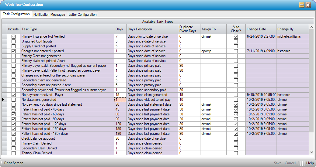 No Payment received – payer | If no insurance payment has been received from the currently assigned payer within the days designated, a task will generate. | When an insurance payment from the currently assigned payer is entered and posted, the task will auto close. |